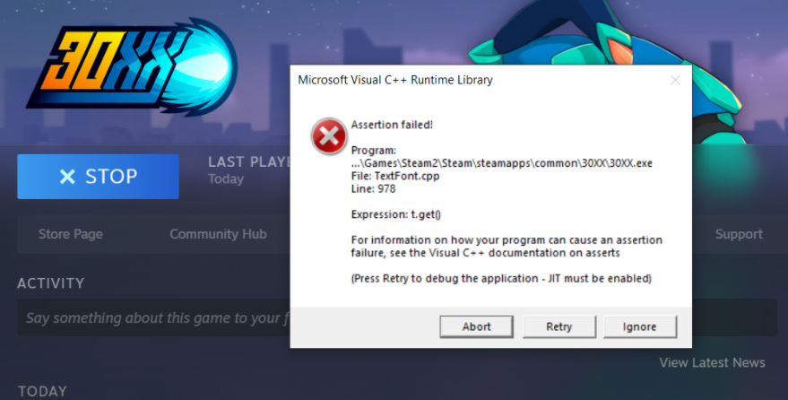 | Description | Whenever I try to start up 30XX, a "Assertion failed!" crash happens. I tried reinstalling, validating Steam files, but nothing worked. Please see included picture for full error window. | ||||
