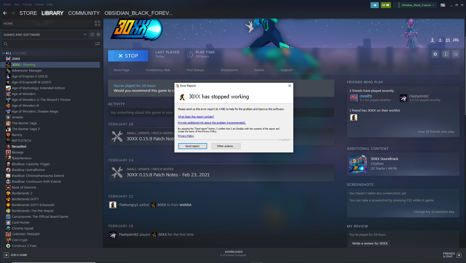 | Description | Since the most recent patch (0.15.9) the game has crashed each time I've used Crystal Wave (+ Rending Whirl in my case) to freeze the hunter orbs in the Prenumbra stage. At the time this occurred I was playing online co-op in Standard Mode. |
