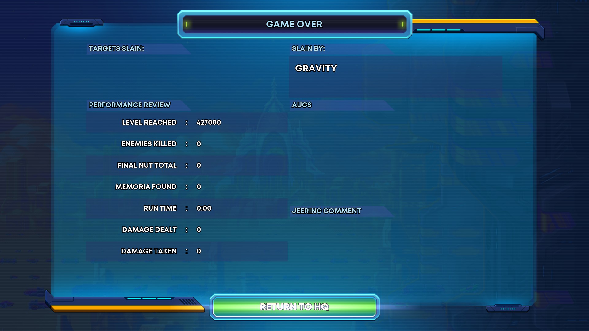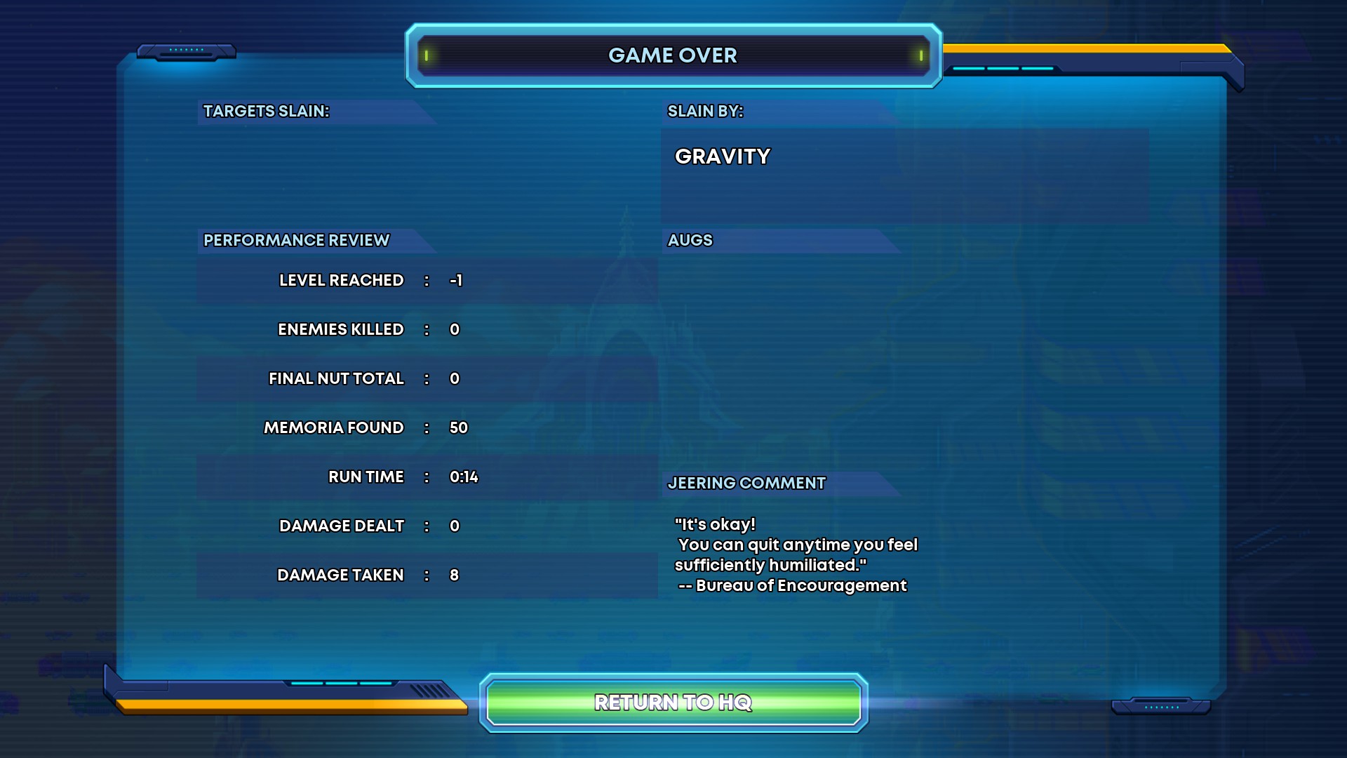 | Description | On attempt to join multiplayer from title screen, will fail to join multiplayer, player character (default Nina?) spawns on the backdrop of the title screen and falls, damage zone at bottom brings character back to centre to repeat until death. Death screen will scroll up in level until skipped to reach -1 levels cleared. Game then returns you to HQ. |
