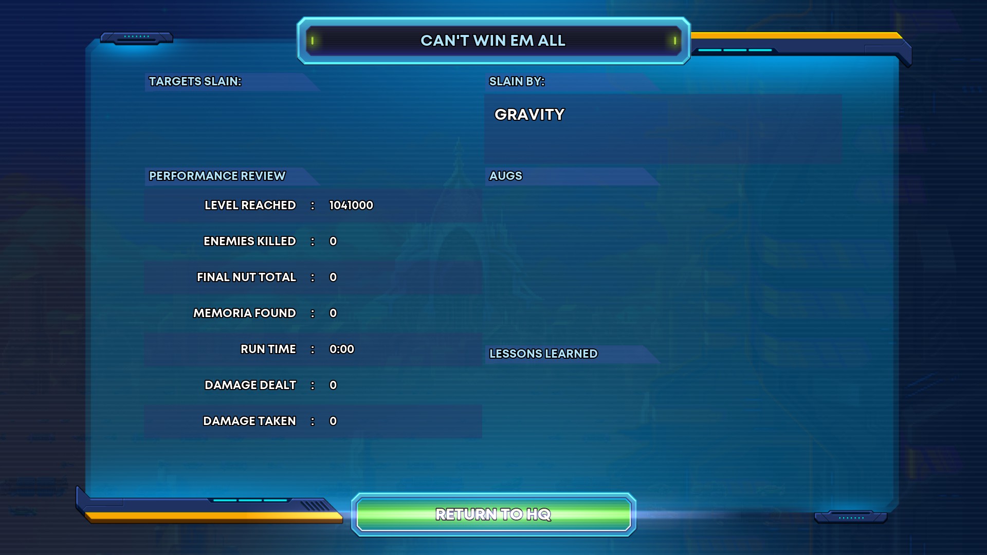 | Description | Starting game and the previous character I played as (Nina in this case) spawn over the opening menu background after the menu disappeared instead of in the HQ Hub. She then fell over and over until she died and I got the game over menu and the levels reached went up to over 100,000 and kept rising until I closed it. It put me in HQ Hub after I closed the game over screen. |