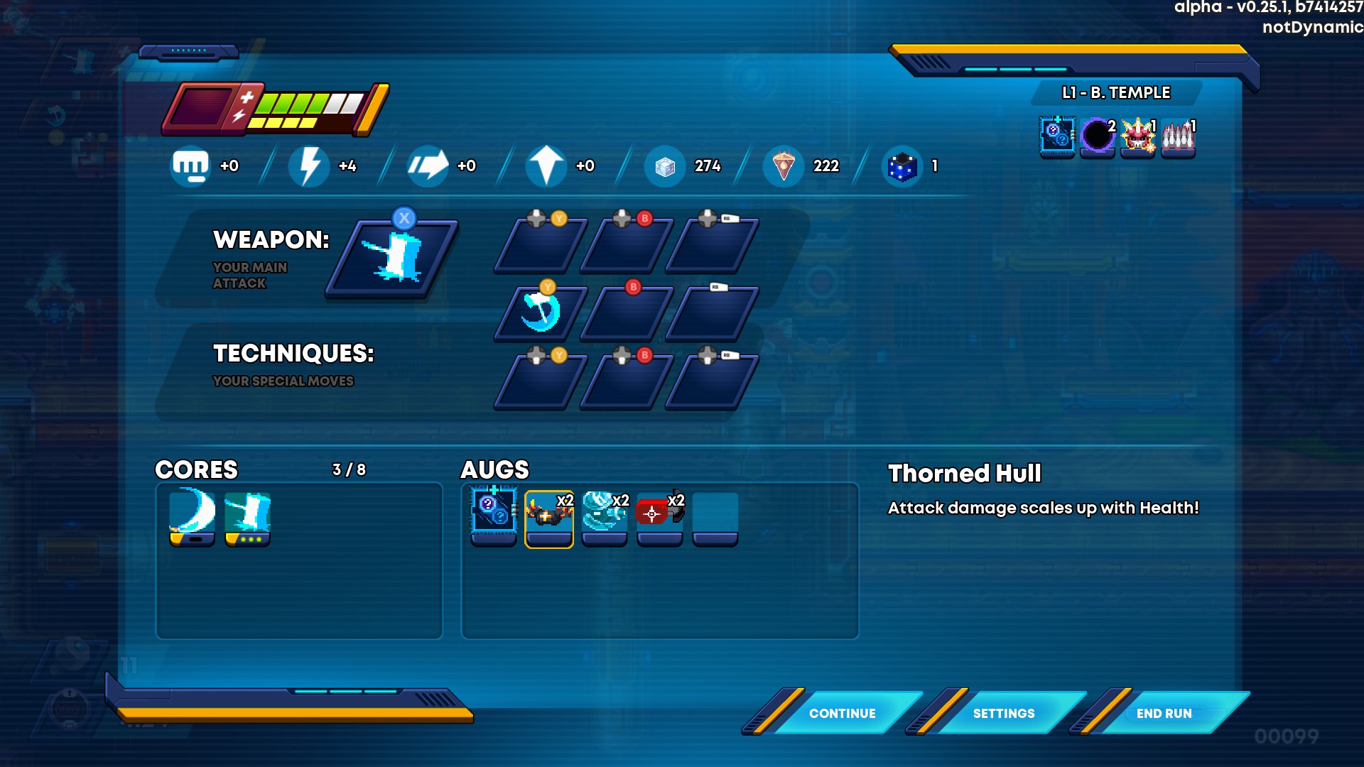 | Description | I played a daily challenge with Hysteria (every aug pickup gives 2 copies), and I picked up Thorned Hull (attack increases with HP), and got 2x, then I picked up Glass Cannon (HP down, Attack up, Power Damage up), and got 2x. These were pretty much the only augs I picked up at that point. What I expected would happen, was I would not gain any attack through Thorned Hull, but I would still gain 4 attack from the 2 Glass Cannon. What happened instead was I gained no attack and lost 4 HP and gained 4 power damage. If I had been already sitting on a bunch of HP buffs, this net 0 attack change in exchange for 4 HP loss is something I would have expected, but I had no HP buffs at that point. It feels like Thorned Hull from its description should be built such that the minimum attack modification it should be able to provide is 0, it should be unable to go into negative, yet it is currently able to supply negative modification to your attack. I was essentially punished for having picked up Thorned Hull earlier once I picked up Glass Cannon, because with only Glass Cannon 2x my attack stat would have been 4 higher. | ||||