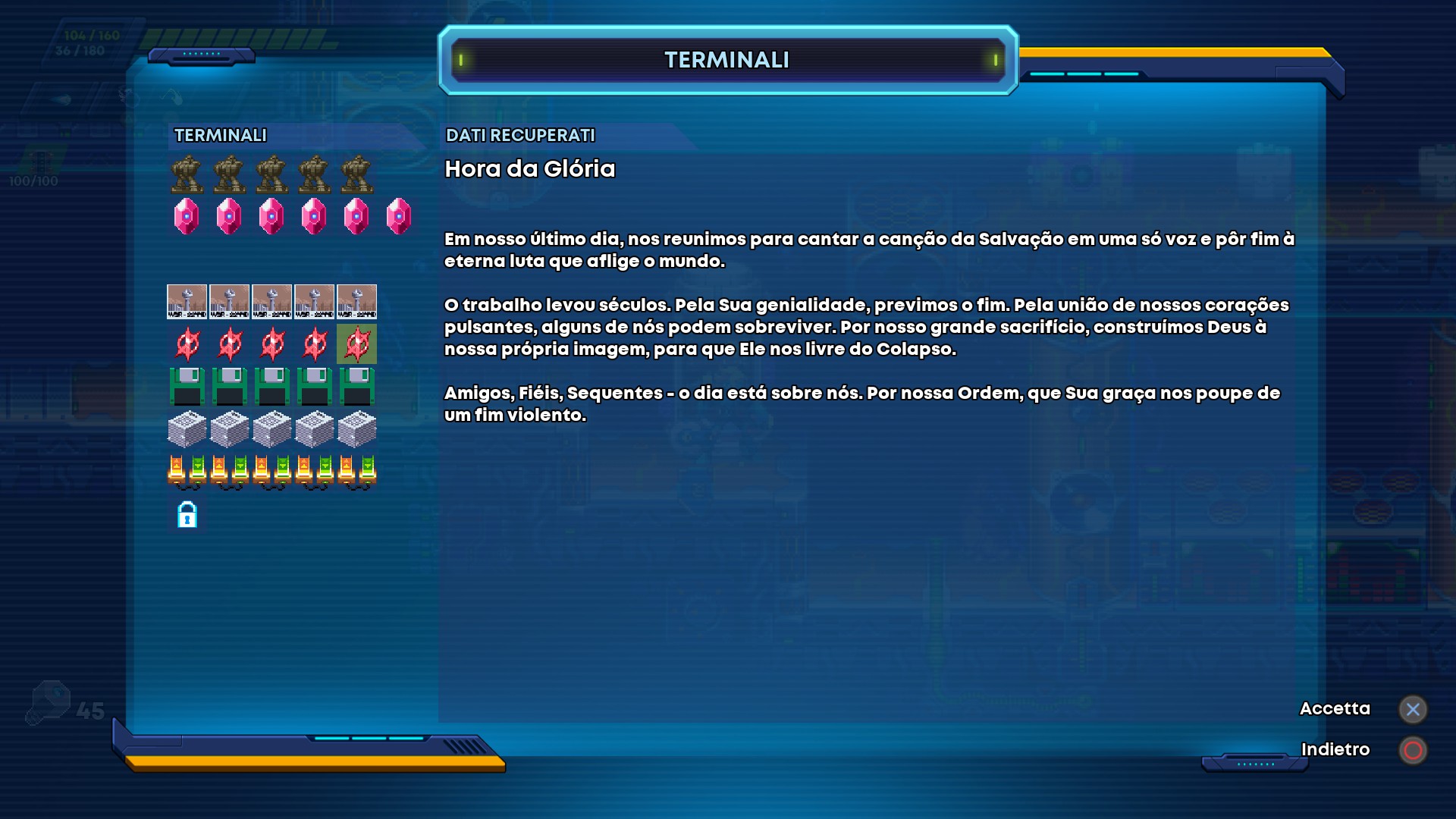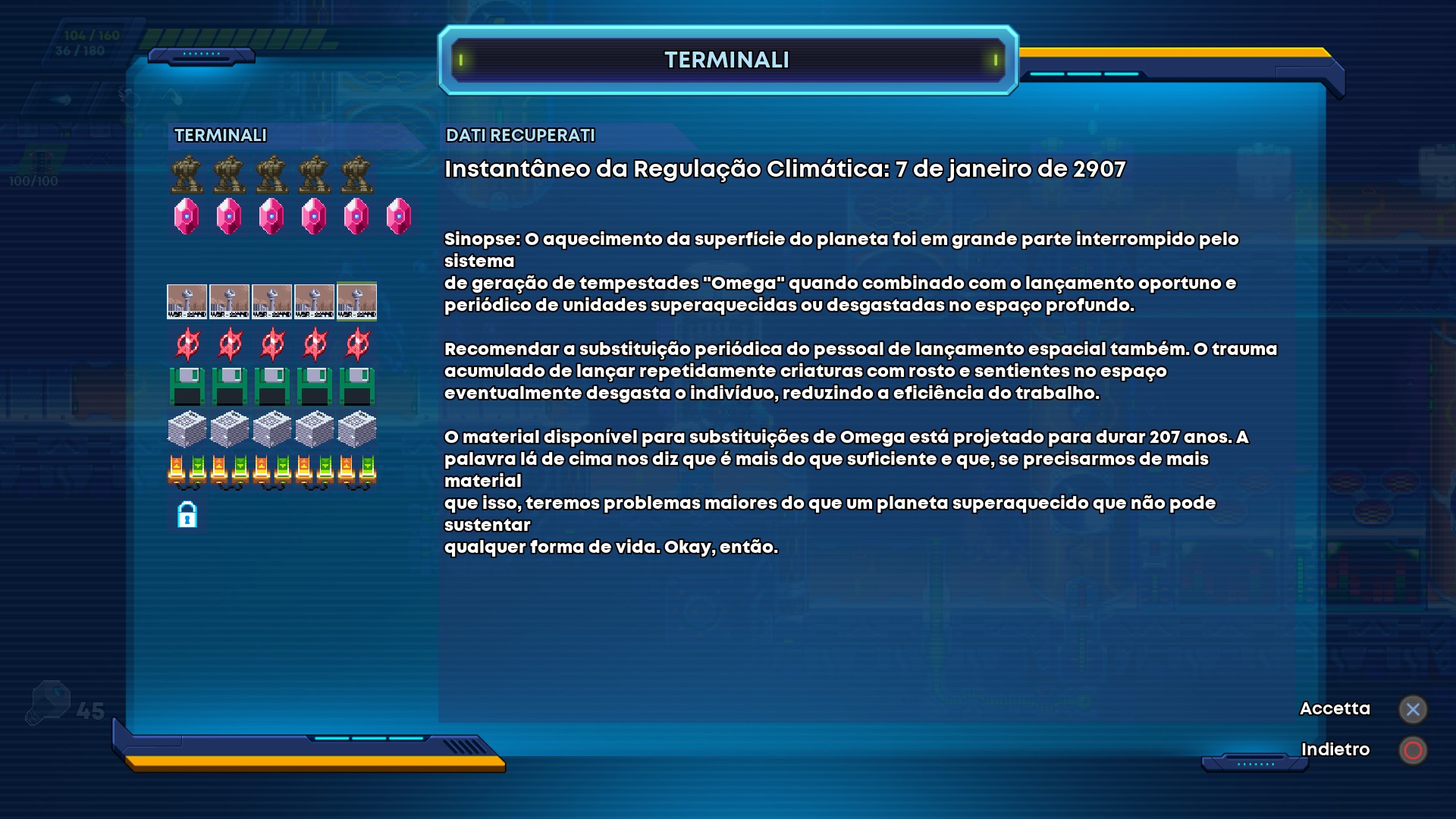 | Steps To Reproduce | Start 30xx with Settings --> Video --> Language --> Italian Start a game in standard mod, push Pause --> Datalore Datalore in 4th and 5th rows are in Portuguese Datalore in 3th row are English | ||||